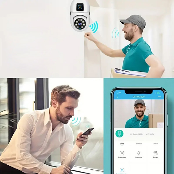 Dzięki głośnikowi interkomu BULBCAM możesz rozmawiać bezpośrednio przez telefon komórkowy z każdą osobą znajdującą się przed drzwiami. Możesz również wydawać instrukcje dostawcom, a nawet oprowadzać gości, jeśli jesteś zajęty lub nieobecny, co ułatwia zarządzanie gośćmi z dowolnego miejsca.