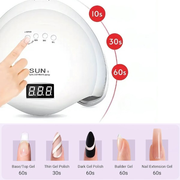 Dzięki 3 ustawieniom timera (10 s, 30 s, 60 s) możesz dostosować proces suszenia do rodzaju żelu i indywidualnych potrzeb. Inteligentny czujnik automatycznie włącza się, gdy Twoje dłonie lub stopy znajdą się pod lampą, zapewniając bezstresowe działanie za każdym razem.